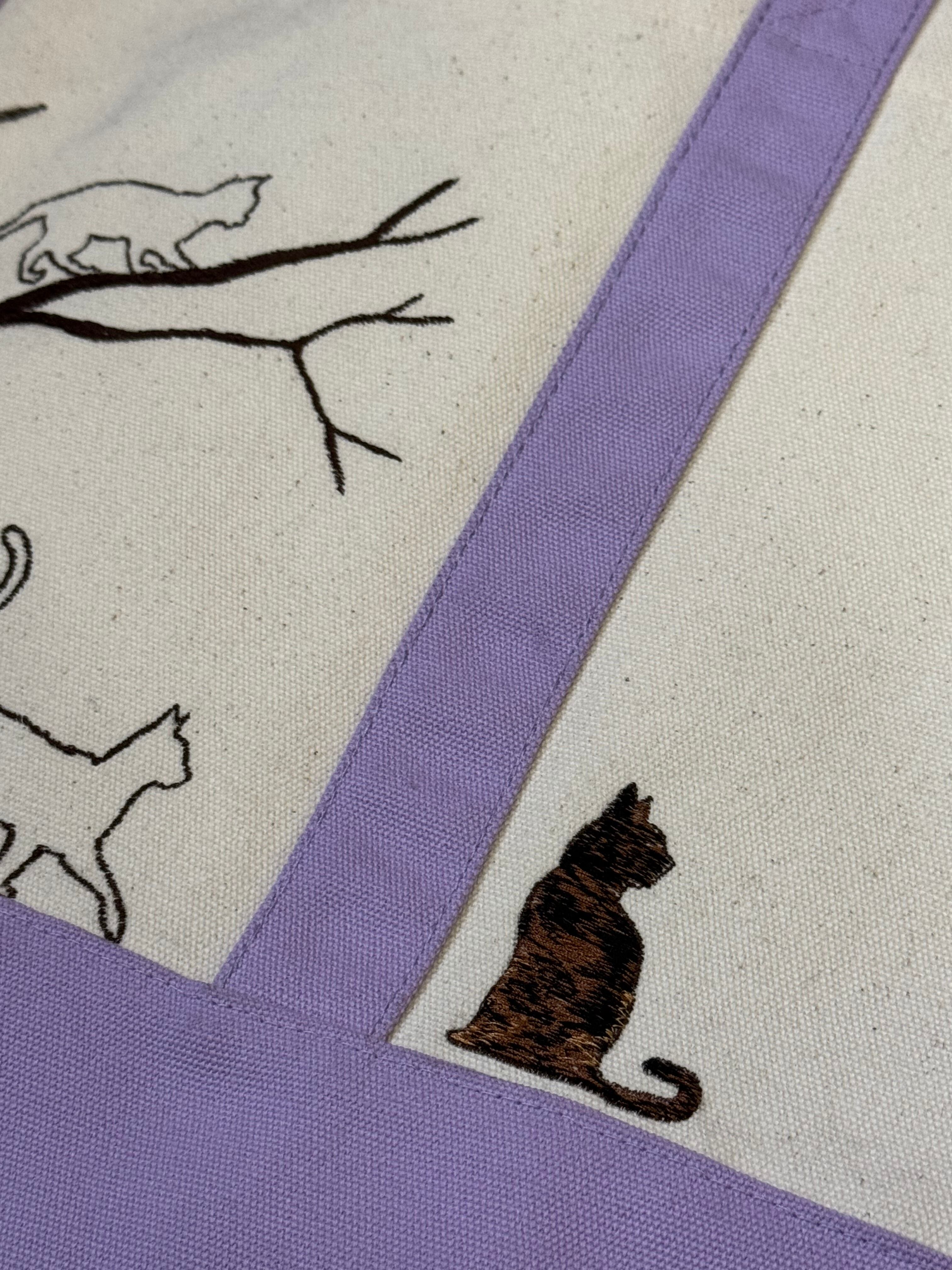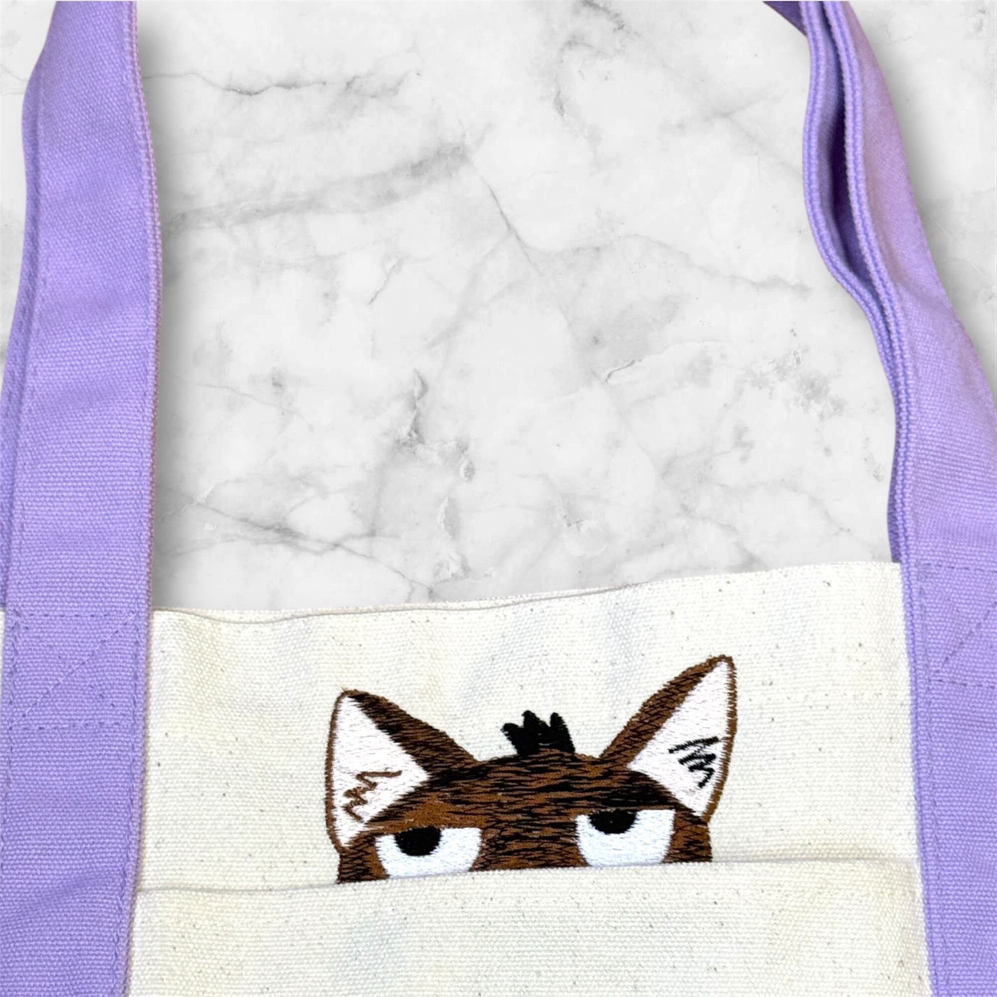 キャンバス生地のトートバッグに、可愛らしいサビ猫を刺繍しました!片面にはシルエット、もう片面にはポケットにキャラクター風のサビ猫をデザインしています。ポケットをめくると、隠れた猫が顔を出すサプライズも楽しめます。